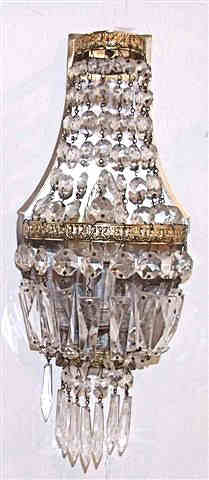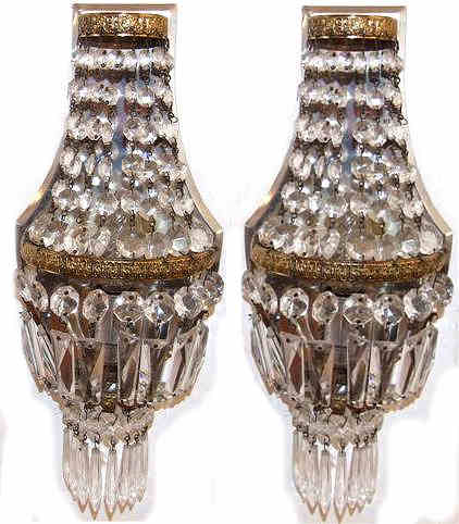 A Pair of matching antique wall lights of purse construction, dating to Circa 1930. These beautiful wall lights have single bulbs and reflective backs which make the glass drops sparkle beautifully when the light hits them. Having been rewired they are ready to hang. dimensions TBC (Ref : CHA24) Email Us for a delivery quote : Click Here