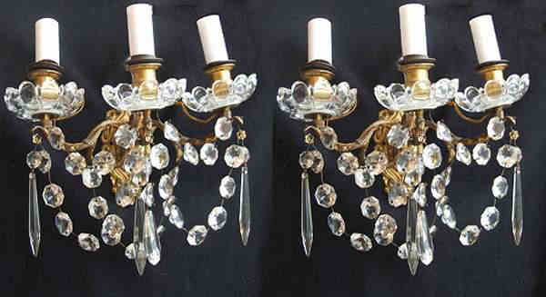 Stunning pair of matching Napoleon 111 style Victorian wall lights A truely stunning pair of matching Napoleon 111 style Victorian wall lights. These are beautifully proportioned, having 3 gilt arms with shaped glasss bobeche all dressed with swags of glass drops with futher icicle drops as decoration. Extremely rare and very hard to find, these would look wonderful in any setting. Height 12" Width 12" Depth 9" (Ref : CHA25) Email Us for a delivery quote : Click Here