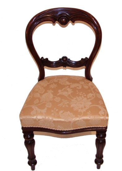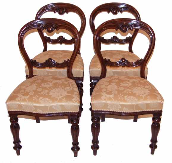 Circa 1850/70, a superb set of four Victorian balloon backed dining chairs. Noticeably well defined detailing on these wonderful chairs make them highly desireable. They feature good sized horse hair filled seats, serpentine fronted, with moulded mahogany edge to the overstuff seat sides. The backs a double drape carving with central buckles. The whole rasied on very fine fluted and turned legs which really are a lovely feature in themselves. The beauty of these chairs is that may balloon backs are very delicate and not really suitable for everyday use but these are exceptionally sturdy, all joints having been checked and have now been reupholstered in a lovely gold material with soft foliate detailing and gold braid. Lovely Price £1495 (Ref : D54) Email Us for a delivery quote : Click Here