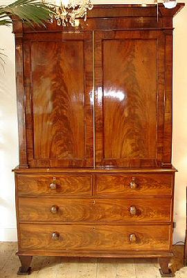 Made circa 1830, an impressive flame mahogany linen press wardrobe.