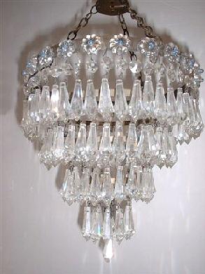 Circa Early 20th Century, this attractive four tier chandelier has an unusual decorative rim, the glass flowers decorating it are further enhanced by pale blue glass centres. A most eyecatching light! Height (from rim) 10" Width 10" Rewired £195