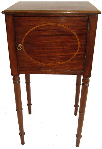 A 19th Century delicate single door Inlaid Mahogany Pot Cupboard standing on slender turned legs.