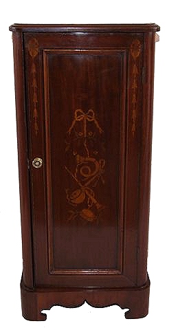 bedside cabinet has beautiful marquetry inlay to the door depicting mandolins