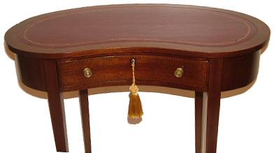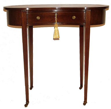 Circa 1900, a small Kidney Shaped Mahogany Inlaid Writing Desk witth single drawer and brass handles standing on slim tapering legs with original brass castors. Fully locking. width 30" Depth 15" Height 28.5"