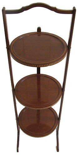 An Edwardian Mahogany and Inlaid Circular Three Tier Folding Cake stand on splayed end supports.. The concentric circular 3 tiers are bordered with attractive boxwood inlay.