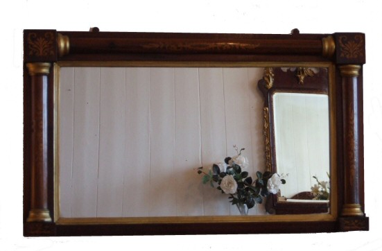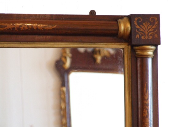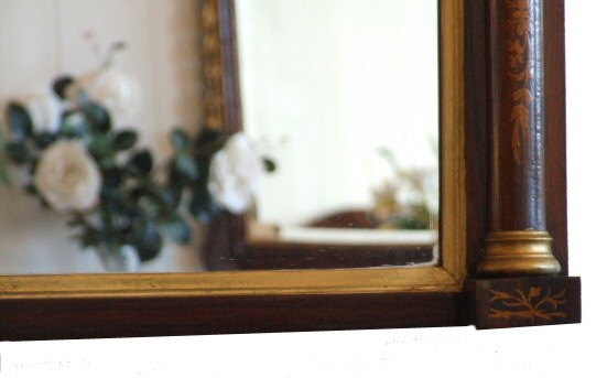 Beautiful Rosewood inlaid Regency Overmantle mirror Of small proportions this lovely Regency overmantle mirror is in Rosewood and a lovely rich colour with wonderful marquetry to the corners and pillasters. The gilt decorative capitals add to the beauty of this mirror. Height 19.5" Width 33.5"