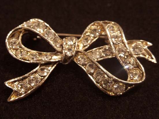 Vintage diamonte brooch in the shape of a bow Attractive and classic bow design, this vintage diamonte brooch has the outline of a bow with diamonte stones inset . Very attractive and perfect condition.