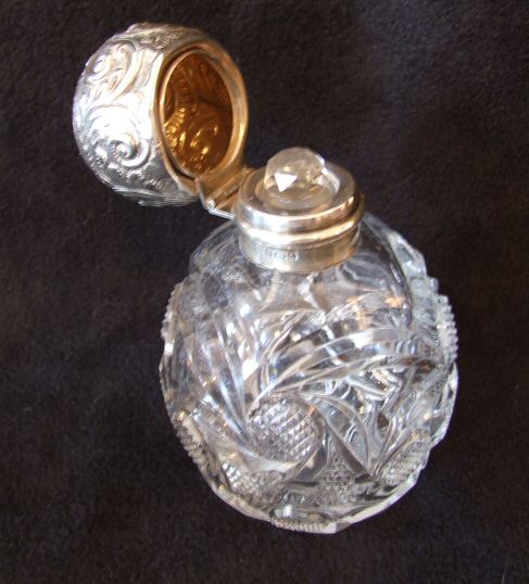 Edwardian antique perfume bottle This beautiful antique perfume bottle is in perfect condition including the original faceted stopper. The clear glass bottle has a silver collar and beautifully embossed lid with the makers mark of Martin and Hall, 1904 Birmingham clearly visible. In beautiful condition this antique scent bottle is large enough to make an imrpession on its own. Would make a wonderful gift. Height 6" Width 3.5" Price £`195.00 (Ref :Misc31) Email Us for a delivery quote : Click Here