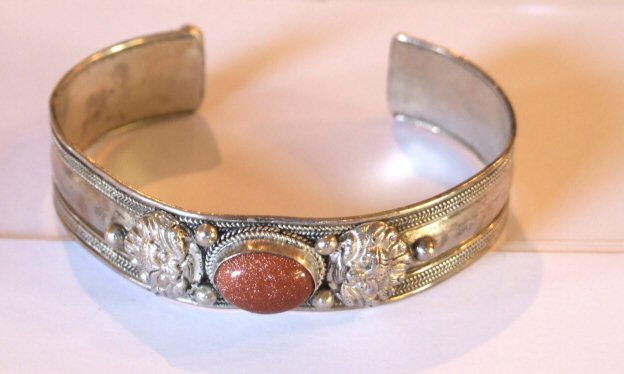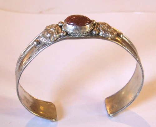 A lovely elegant silver pated ladies bangle with attractive chinese masks to either side of the amber irridescent stone and also to the opening of the bangle. Gift wrapped and in a presentation box. width 6.5cms Price £38 (Ref : MISC338) Email Us for a delivery quote : Click Here