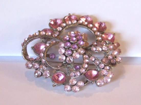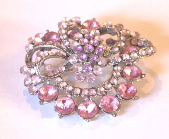 Attractive vintage pink diamonte ladies brooch A most attractive classic diamonte brooch with large pink stones of varying degrees of shades of pink and lilac. Good size and impressively sparkling! Widt 5.5cms £28 (Ref : MISC339) Email Us for a delivery quote : Click Here
