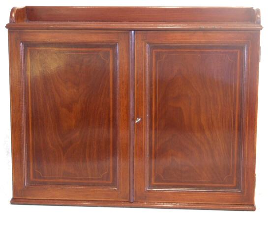 Attractive Edwardian Inlaid Wall hanging cabinet Circa 1900 a mahogany inlaid wall cabinet, the flame doors with satinwood decoration and fully working lock and key. The door opens to reveal a shelved interior. Green baise lined base allows this to be placed on a piece of furniture or hung via wall brackets. Extremely useful small cabinet. Height 20" Width 24.25" Depth 6.25" £395 Email Us for a delivery quote :Click Here (Ref :MISC42)