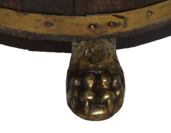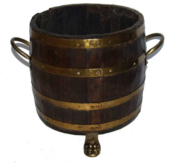 Circa 1880 a coopered log bin Dating to Circa 1880 this attractive and very useful brass bound coopered log bin has well defined brass lion paw feet and substantial brass handles Height 16" max Width 20" max (including handles) Width of actual bin 15" SOLD (Ref : MISC70) Email Us for a delivery quote : Click Here