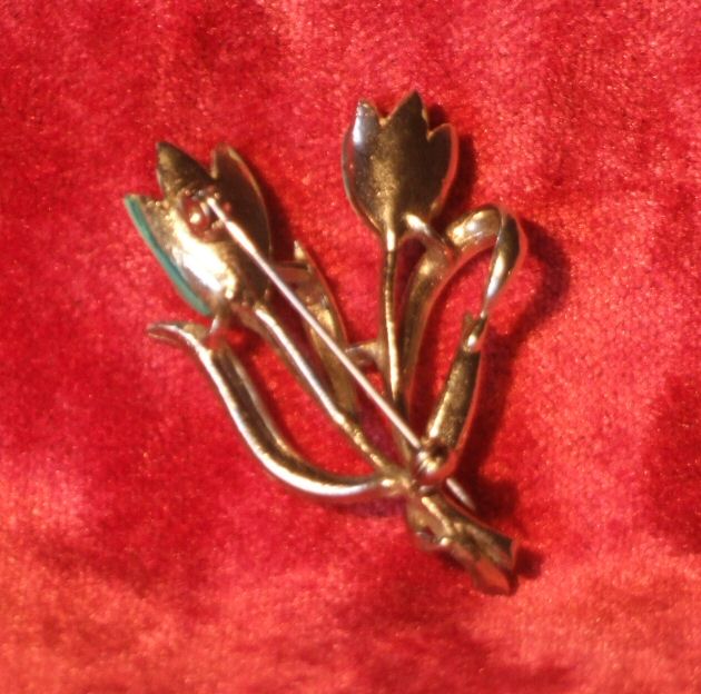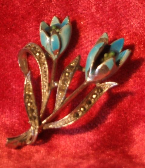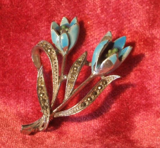 Pretty antique brooch of 2 blue enamel flowers A lovely antique brooch with 2 pretty blue enamel flowers (small loss to one of the petals as can be seen in the photo) raised on silver coloured stem with leafs dressed with small diamonte stones to add a little sparkle. Gift boxed! Width 4 cms Height 5 cms £28 (Ref : MISC805) Email Us for a delivery quote : Click Here