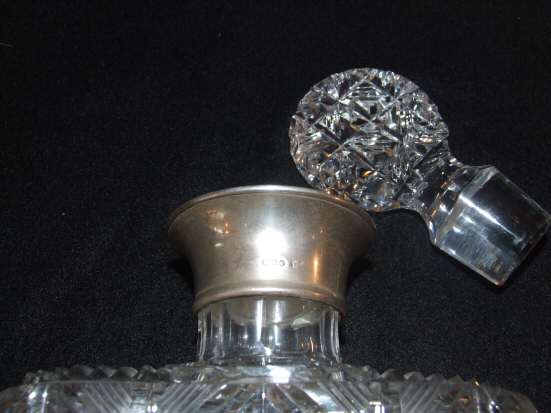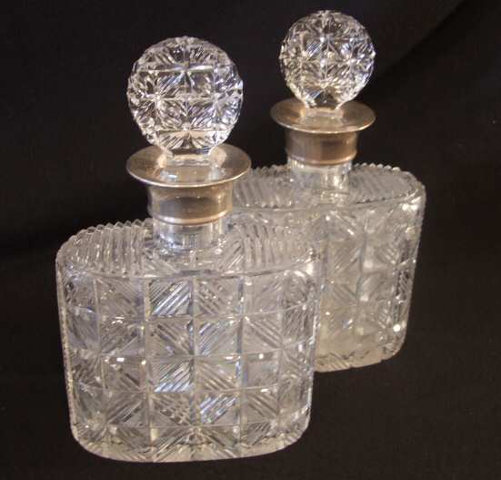 Pair of Edwardian Cut Glass Whisky Decanters A stunning pair of matching cut glass whisky decanters with solid silver collars and hallmarks. The original stoppers in perfect condition. Both decanters are in excellent original condition with no chips or scuffs, a wonderful and rare find. Height 11" Width 7" (Ref:MISC94) Email Us for a delivery quote : Click Here