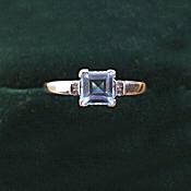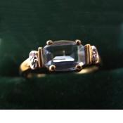 Beautiful antique aquamarine ring on 18 ct gold band with diamonds either side of the central stone, size N £295 (Ref:MISC773) click photo for more info |