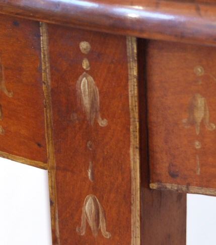 Edwardian satinwood painted side table A beautiful example of n Edwardian antique satinwood oval painted side table on slender tapered legs with painted bellflower decoration to the legs and frieze. The undertier being decorated with a painted basket of flowers, with a beautiful painted maiden to the top. Highly decorative and very unusual. Height 29" Width 22" by 15" PRICE £550 (Ref:TAB49) Email Us for a delivery quote : Click Here