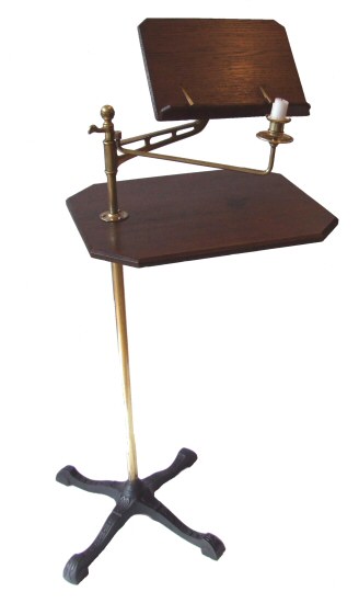 Late Victorian polished brass and oak adjustable music/reading stand Dating to 1895 this attractive polished brass and oak adjustable music/reading stand has rectangular oak shelves with canted corners supported on a polished brass stem with pivoting and adjustable reading slope accompanied by brass rotating candle sconce. The whole raised on a pretty four splay cast iron base. Price £695 (Ref:TAB91) Email Us for a delivery quote : Click Here
