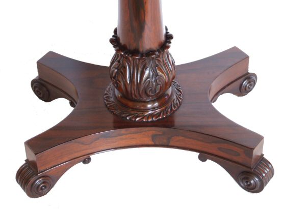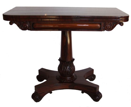 W1Vth Rosewood Card Table A beautiful W1Vth rosewood card table of rectangular form with roundedcorners, the top opening to reveal a claret velvet lined interior in excellent condition. The whole raised on attractive quadriform base with scrolling feet and beautiful upturned lotus leaf to the stem. A lovely rich colour. Presented in beautiful condition. Height 28.5" Width 36" Depth 18" £1295 (Ref :TAB93) Email Us for a delivery quote : Click Here
