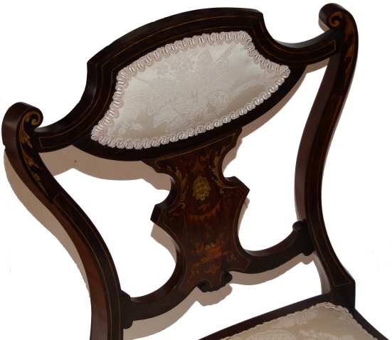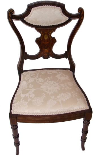 Circa 1900 a small Edwardian Inlaid chair Circa 1900 a pretty Edwardian side chair of small proportions. This attractive chair has beautiful inlaid decoration depicting scrolling acanthus, a lion masks and decorative urn filled with marquetry fruits. Having been stripped to a bare frame and had the joints checked this pretty little chair has been re-upholstered in a cream damask which contrasts beautifully with all the inlay decoration. Ideal for a bedroom or a small corner. Height of seat 16" Max height 32"
