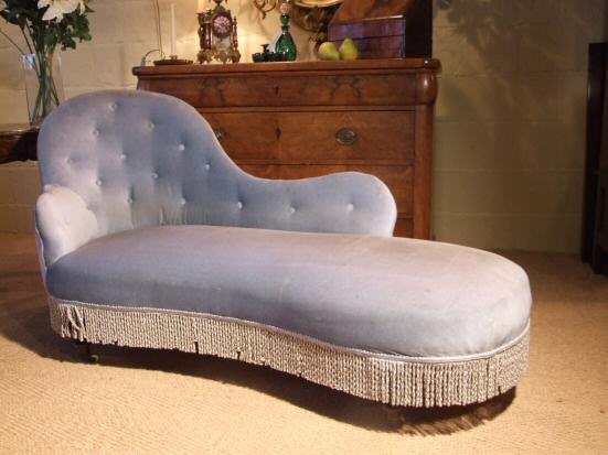 Early Victorian chaise longue Attractive Early Victorian chaise longue, unusual kidney shaped seat with deep buttoned arched headrest , overstuff seat the whole raised on turned mahogany legs with original white porcelain casters. Price includes reupholstering in a material of your direction..if you are quick!! W 68" H 34" H of seat 17" D 25" Price £1295 (Ref:UPH139)
