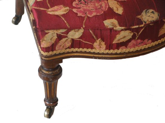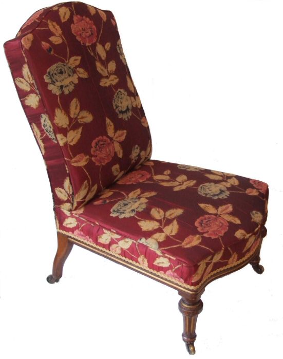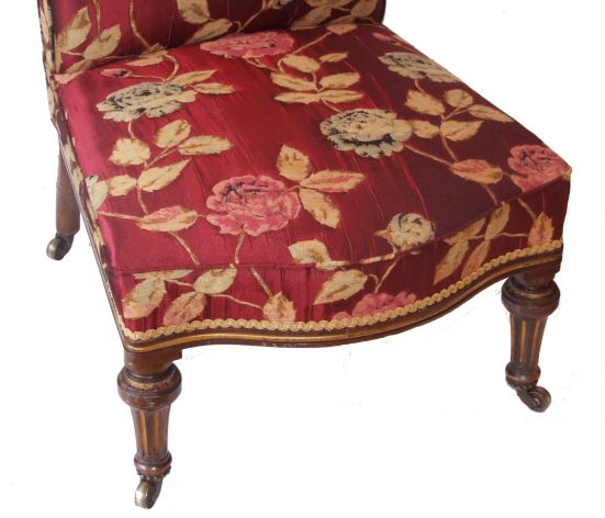 Regency low side chair A truly beautiful example of a Regency low side chair, the whole having been stripped to a bare frame and clamped prior to traditionally reupholstering including replacing springs, webbing etc, covered in a wonderful deep damson silk with flower and leaf decoration in golds and pinks, the serpentine shaped seat is piped and braided in gold. The whole raised on walnut legs the reeding enhanced with gilt decoration on small brass and ceramic casters. A lovely addition to any room. Height 35" total seat height 13" depth of seat 19"